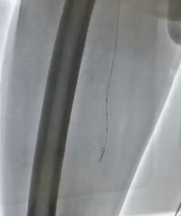 病例2:为股浅长段CTO病变,术中多次尝试,开通极其困难,使用Connect Flex导丝后顺利通过闭塞段。