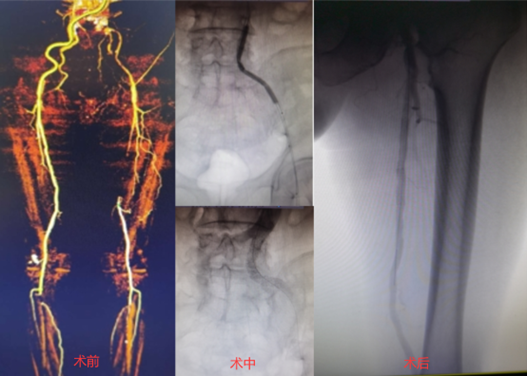 病例3:为Command 18联合Connect flex导丝顺利治疗的髂开口闭塞合并股浅长段CTO病变;术中首先采用逆向技术,穿刺股总动脉,开通髂动脉;随后使用Connect flex导丝顺利开通股浅远端长段CTO病变。